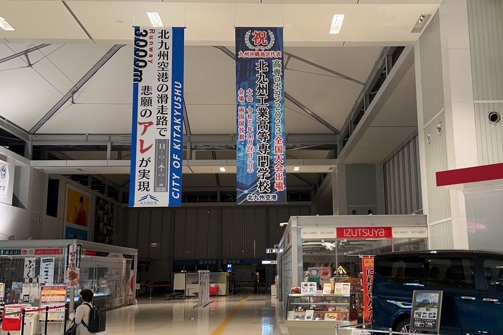 10月15日(日)に開催された高専ロボコン2023九州沖縄地区大会において、本校出場チームが優勝し、11月26日(日)に東京都の両国国技館で開催される全国大会に出場します。 ロボコン部の全国大会出場に際して、北九州エアターミナル株式会社様のご厚意により北九州空港に懸垂幕を掲げていただきました。掲載期間は、11月27日(月)までです。