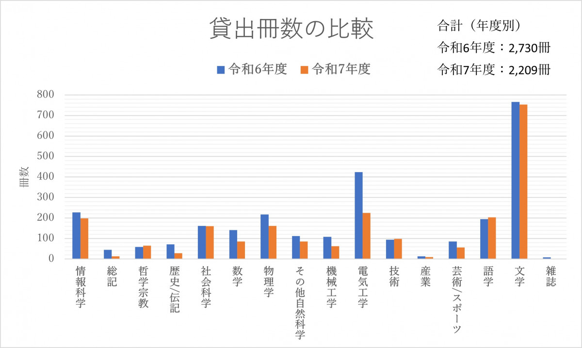 工業高等専門学校であるため理系分野の利用がもともと多い点を踏まえると、今年度(4月~12月)は数学・物理・電気工学などの専門書が前年より減少したものの、全体としては依然として理系分野が大きな割合を占めています。一方で、文学や語学といった読み物・学習系の本は前年並みに利用されており、特に文学は引き続き多くの学生に読まれています。専門学習だけでなく、読書や語学など幅広い分野に触れる学生が増えており、学びの広がりが感じられる結果となりました。