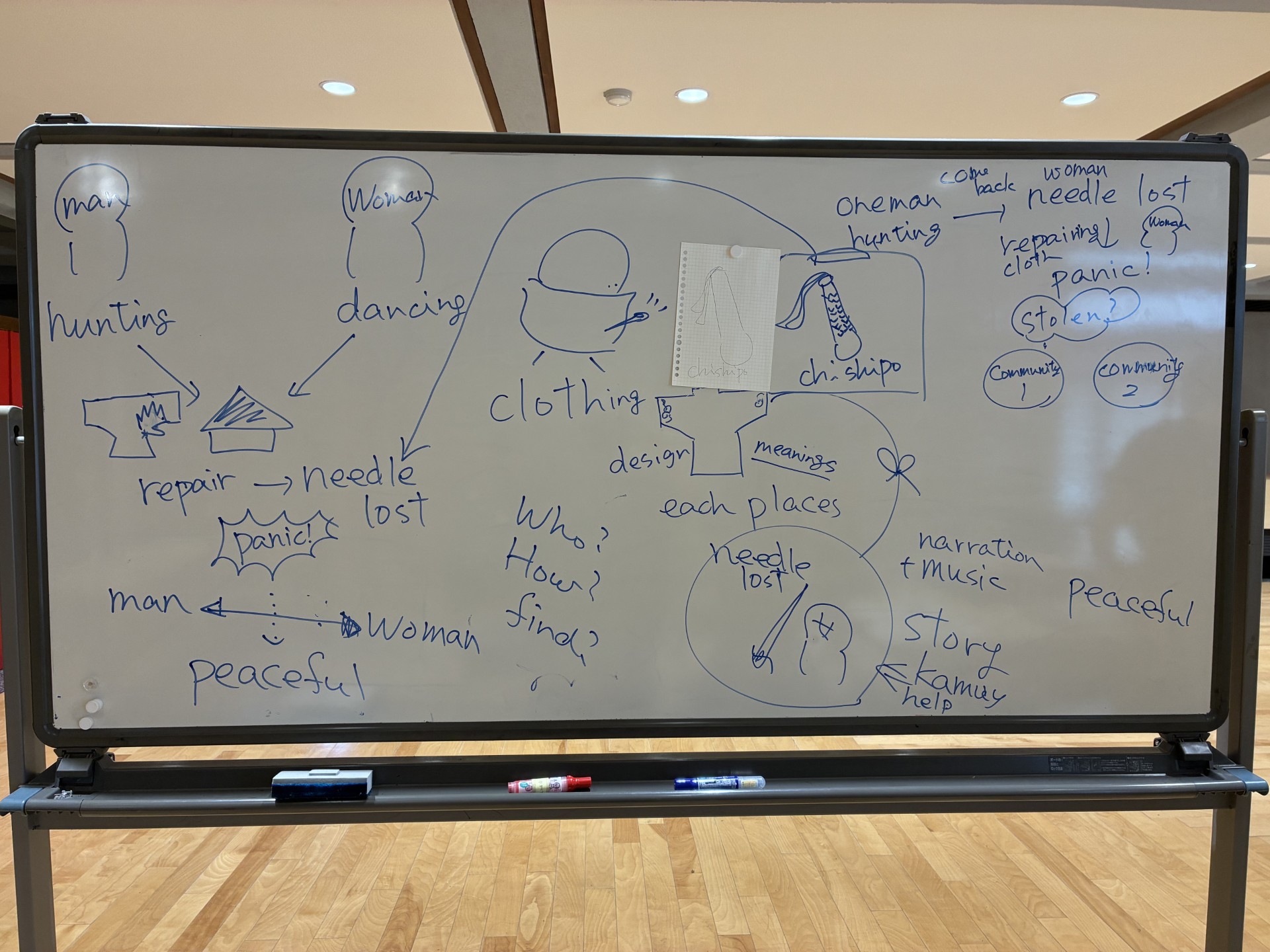 受講した「アイヌ・先住民族アート入門」という講座は、英語で授業が行われ、アメリカ・スコットランド(イギリス)・フランス・インドネシア・中国に、もちろん日本からもアイヌ文化に関心のある人が集まりました。英語は不得手ながら、ジェスチャーとグラフィックレコーディングと片言の中国語とアイヌ語を駆使して、全力で楽しんできました。