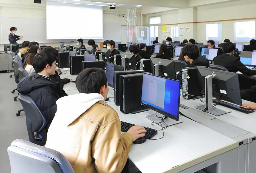 ITセンターは、エンジニアに必要な情報技術の習得を支援するための学内共同利用施設です。北九州高専の情報ネットワークやインターネット接続のための通信機器を備え、利便性に優れた情報通信サービスを提供しています。情報化対応室として、学生用PC50台を保有するマルチメディア学習室と、学生用PC70台を保有するCALL教室があり、実験・実習および演習に利用しています。