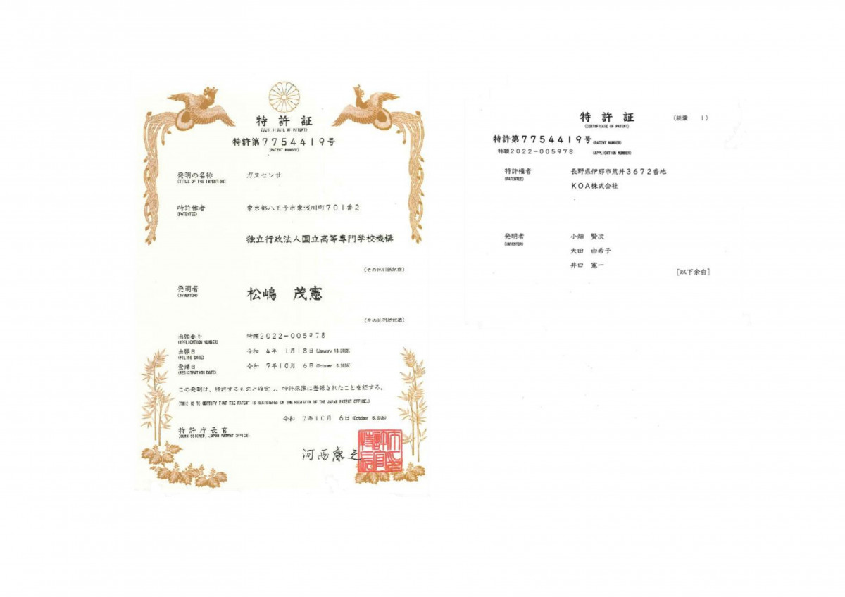物質化学コースの松嶋教授、小畑准教授とKOA株式会社との共同研究で開発された発明(ガスセンサ)が、特許として認定されました。本校は、世界に先駆けた物質・材料研究を推進・展開しています。