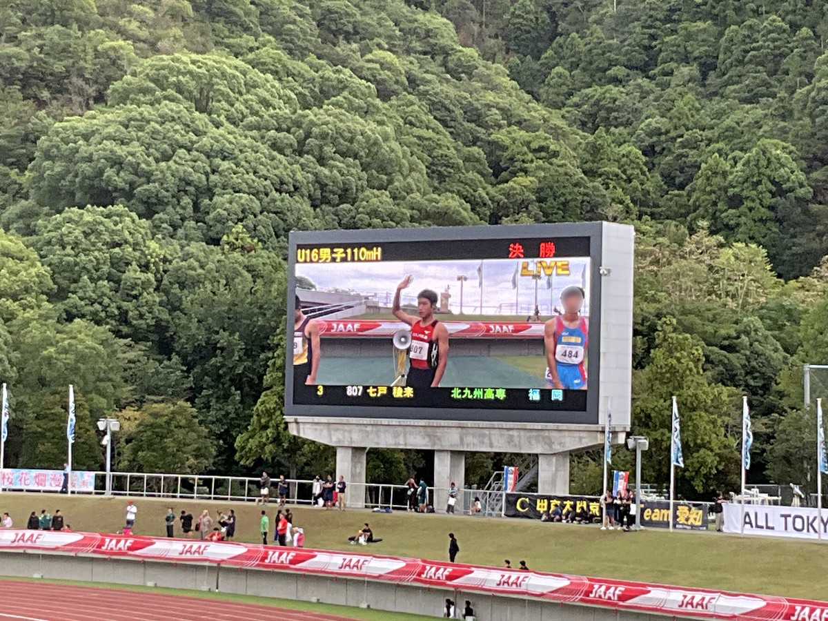 U16男子110mハードルには各県の代表選手47人が出場し、七戸さんは福岡県代表選手として、予選4組2レーンに登場し、1位で決勝に進出を決めました。決勝では3レーンを走り、0.05秒差でメダルこそ逃したものの、全国大会で第4位入賞という素晴らしい成績を収めました。