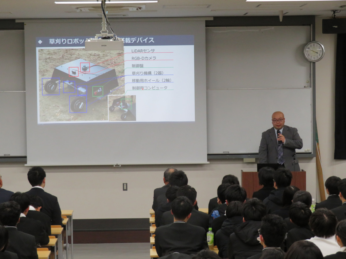 式典終了後には、卒業生による記念講演会を実施しました。「高専での学び×企業(アカデミア)での展開について」をテーマに、2名の卒業生を講師にお迎えしました。企業とアカデミア、それぞれの第一線で活躍する先輩方から、高専時代に培った経験が現在の仕事や研究にどのように活かされているかについて、大変貴重なお話をいただきました。