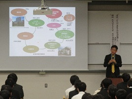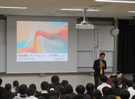 12月2日(火)、FAIS(北九州産業学術推進機構)から産学連携担当部長・三戸俊和氏を招き、2年生を対象に「グローバルキャリア教育」の一貫として講演会を開催し、「世界で働くということ」をテーマに90分間熱のこもったお話をいただきました。
